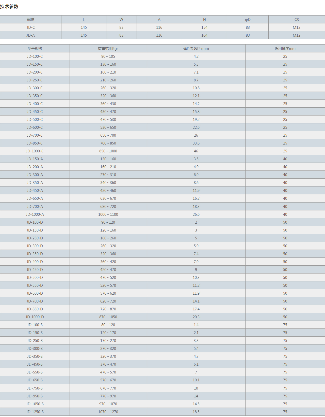 | 型號規格 | 荷重范圍Kgs | 彈性系數㎏/mm | 適用撓度mm |