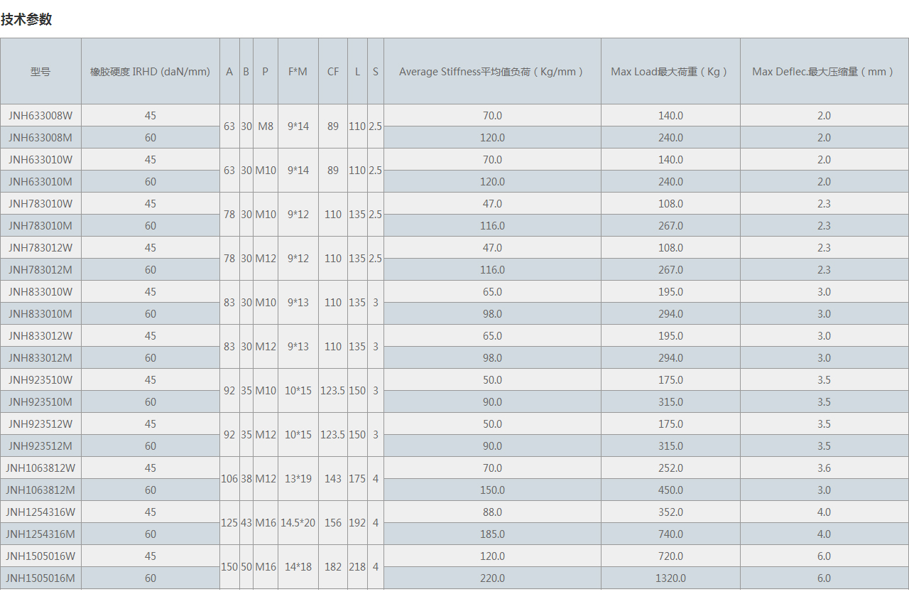 2、結(jié)構簡單,安裝方便,為了保證JNH橡膠避震器彈簧的橫向穩(wěn)定,很佳荷載為預壓承載上下40%。