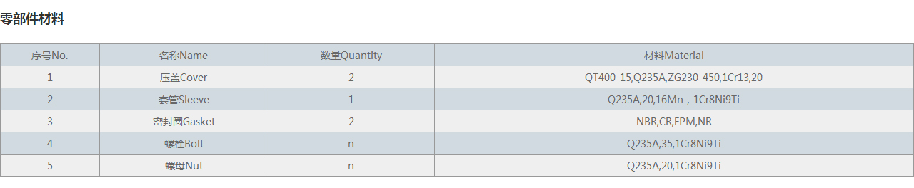 | 2 | 壓蓋Cover | 1 | QT400-15 、Q235A 、20、 ZG230-450 、1Cr13 |