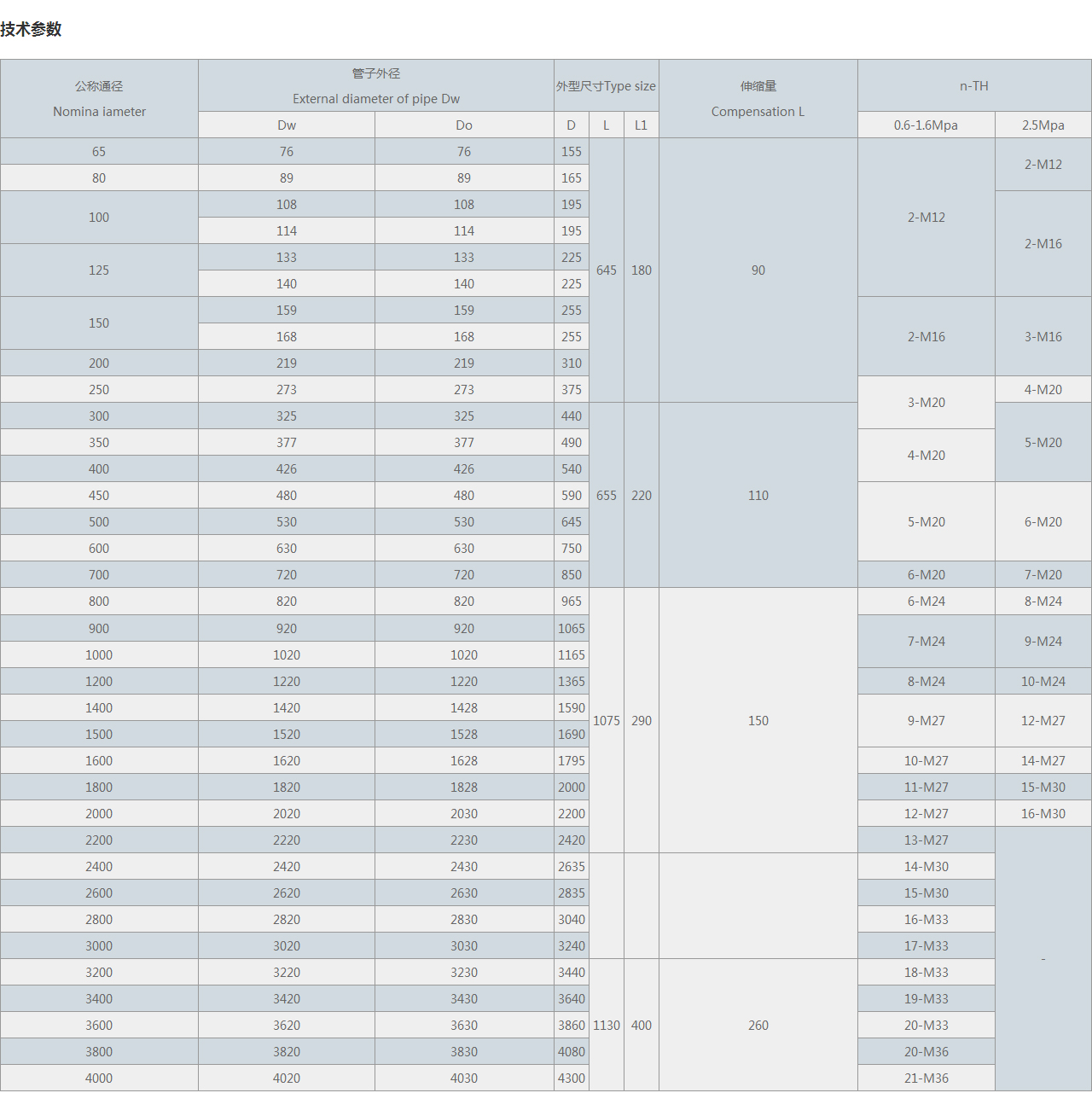 | Dw | Do | D | L | L1 | 0.6-1.6Mpa | 2.5Mpa | |||
