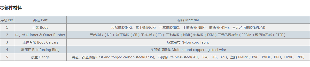 | 2 | 內、外襯 Inner & Outer Rubber | 天然橡膠(NR) 氯丁橡膠(CR)丁基橡膠(IIR) 丁腈橡膠(NBR)氟橡膠(FKM)三元乙丙橡膠(EPDM)聚四氟乙烯(PTFE) |